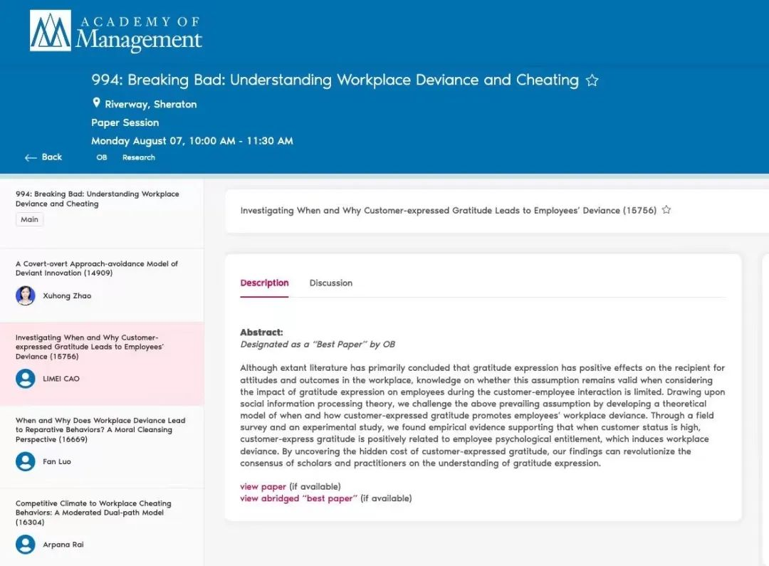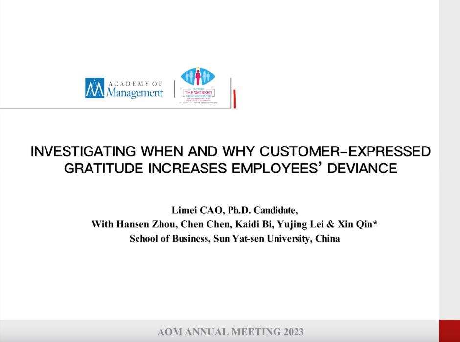 第83届AOM年会(The 83rd Annual Meeting of the Academy of Management)在美国波士顿以线上与线下相结合的方式举行。我院多名研究生在此届AOM年会宣讲研究成果,其中秦昕教授(通讯作者)、博士研究生曹李梅(第一作者)、硕士研究生周汉森、陈晨副教授、硕士研究生毕凯迪、本科生雷雨静合作的《调查顾客的感恩表达何时以及为何会增加员工工作场所偏差》获得组织行为分部最佳论文奖。
