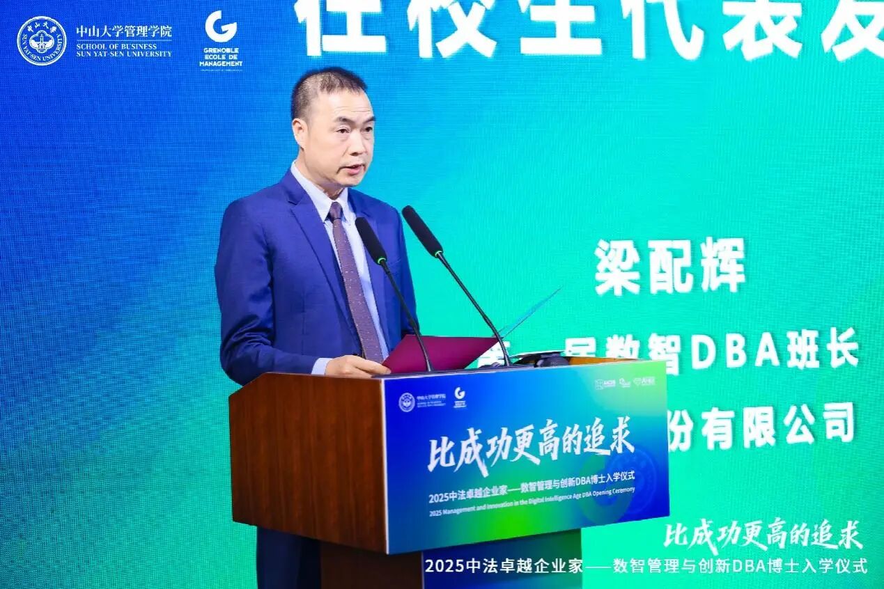 首届数智DBA项目班长、广东美捷时控股股份有限公司董事长梁配辉分享了他的学习体悟,强调 DBA不仅是学历的提升,更是领导者成长的生态平台。他表示愿与各位师生一道,在AI浪潮中提升智能素养、关注科技伦理、加强跨界协同,秉承“博学、审问、慎思、明辨、笃行”校训,善用人工智能,驶向商业新蓝海。