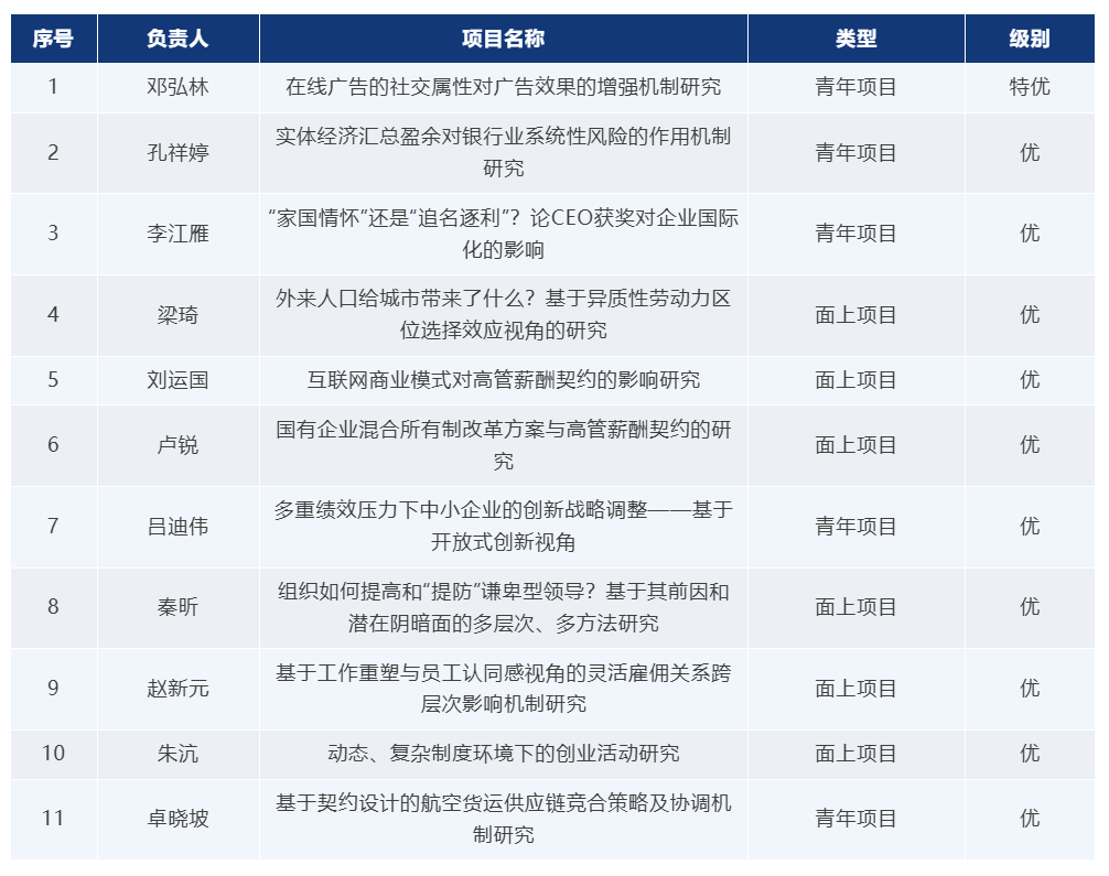 近日,国家自然科学基金委管理科学部公布了新一期国家自然基金结题项目后评估结果,永利集团3044官网402永利集团官网取得了“1特优10优5良”的好成绩。获评优秀的项目包括6项面上项目,5项青年科学基金项目。