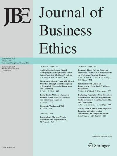 Journal of Business Ethics是一份在商业和伦理领域享有国际声誉的高水平学术期刊。该期刊由荷兰克鲁维尔学术出版集团出版,致力于刊载与商业相关的伦理学文章,其范围涵盖了从道德角度对生产体系、消费、销售、广告、社会经济效益、劳资关系、公共关系以及组织行为等方面问题的深入探讨。该期刊的影响力广泛,是英国《金融时报》认定的50本全球经管类权威期刊之一(FT50:Financial Times 50 Journals)。