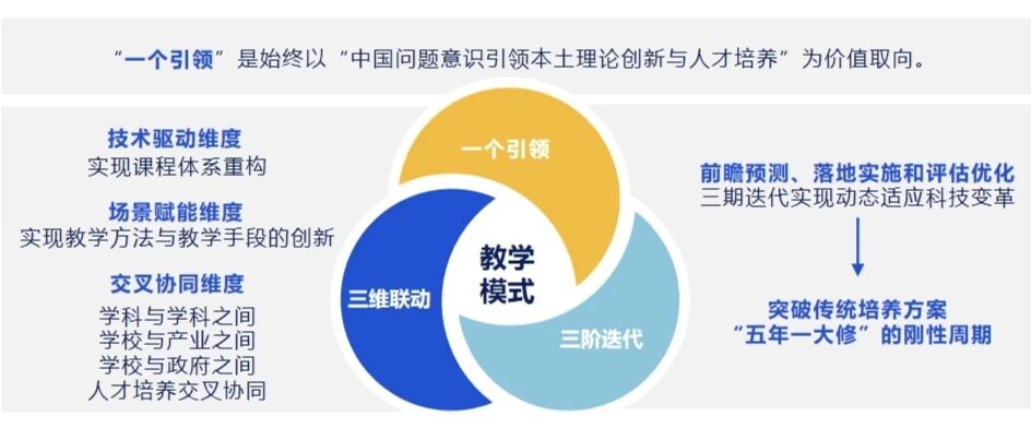 - “三维联动”:包括“技术驱动维度”下实现课程体系重构、“场景赋能维度”下实现教学方法与教学手段的创新、“交叉协同维度”下实现学科与学科之间、学校与产业之间、学校与政府之间在人才培养上的交叉协同。