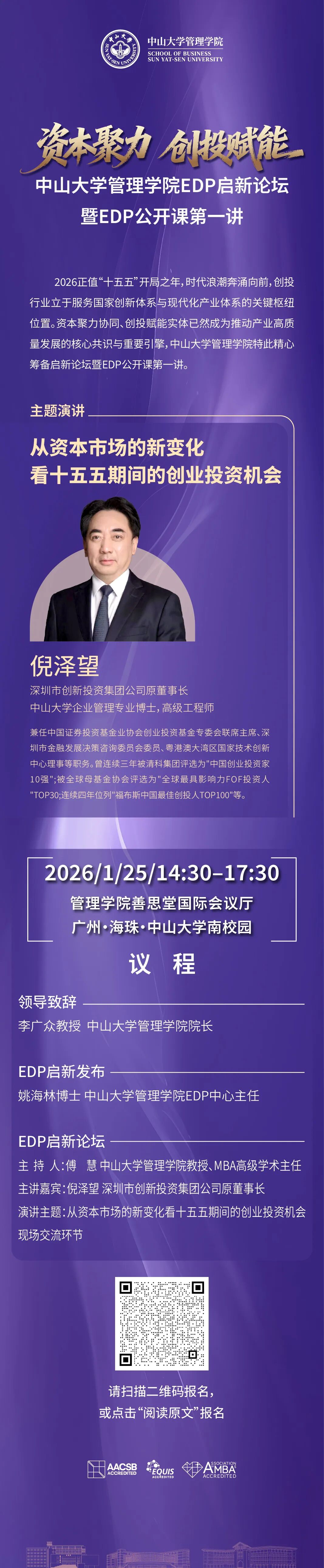导航痕迹 首页 EDP启新论坛丨倪泽望:从资本市场的新变化看“十五五”期间的创业投资机会 EDP启新论坛丨倪泽望:从资本市场的新变化看“十五五”期间的创业投资机会 发布日期:2026-01-16 703 Share 相关信息 征稿通知丨2026年永利集团3044官网402永利集团官网前沿管理研究国际研讨会:新发展格局下的创业研究2026-04-10 剑桥大学数字制造教授在管院讲了啥?2026-04-09 中评社专访|任荣伟:高校以 “三力” 育人才,打造大湾区科创人才高地2026-04-08 第三届粤港澳高校会计案例大赛正式启动2026-04-05 国际影响力丨CJAR入选国际A类期刊2026-04-01