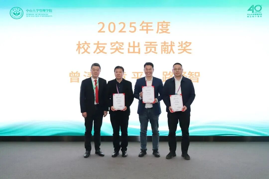曾涛、黄平、路泽智、徐力峰、朱圣勇校友获“2025年度校友突出贡献奖”,颁奖嘉宾为李广众院长。