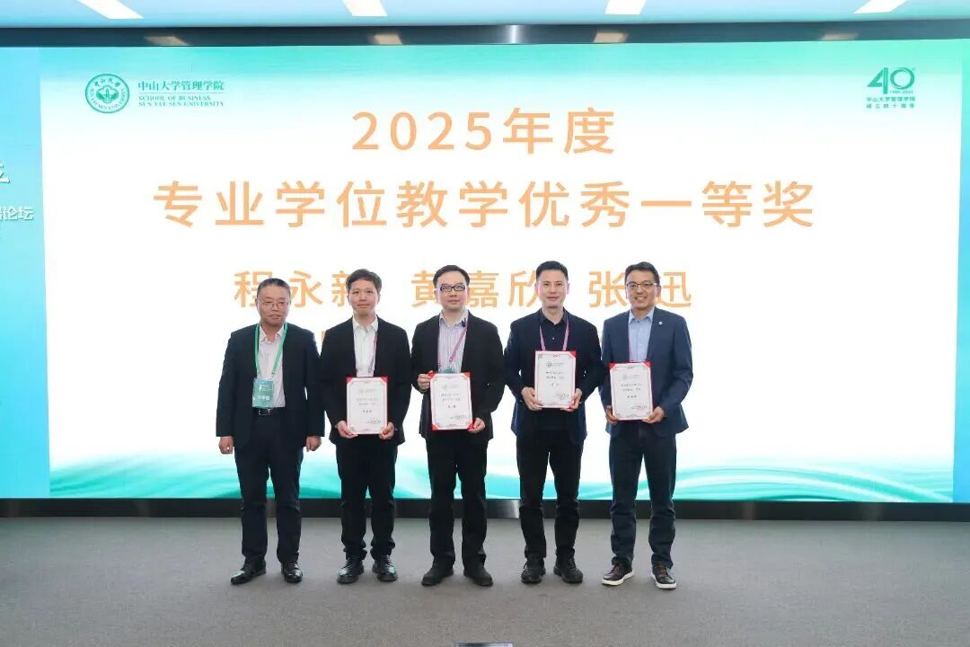 程永新、黄嘉欣、张迅、周少锐、左梁老师获“2025度专业学位教学优秀一等奖”,颁奖嘉宾为于李胜教授。