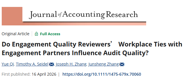 402永利集团官网2025届新毕业的博士生齐悦在校期间的研究成果《Do Engagement Quality Reviewers’ Workplace Ties with Engagement Partners Influence Audit Quality?》近日在国际顶级期刊Journal of Accounting Research上发表。