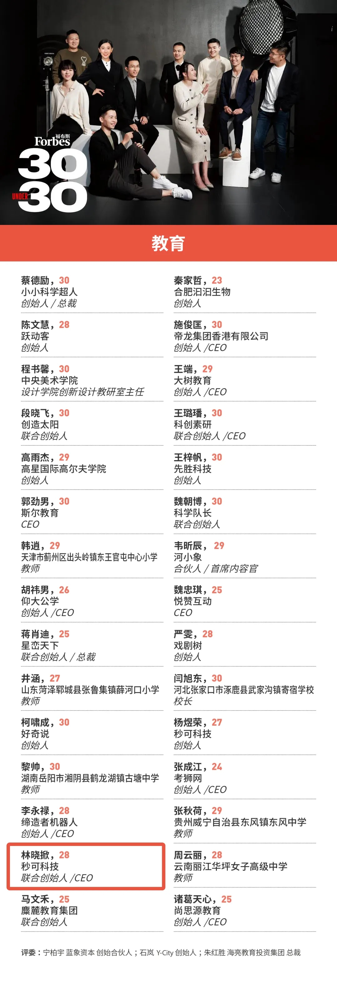 9月16日,福布斯中国推出了2021年度30岁以下精英榜(30 Under 30),选出了300位30岁以下中国各个领域的杰出青年。其中,秒可科技联合创始人、CEO,我院2012级市场营销专业本科、2016级工商管理专业学术硕士研究生校友林晓掀成功入选福布斯中国2021年度30 Under 30榜单,成为教育领域青年才俊代表。