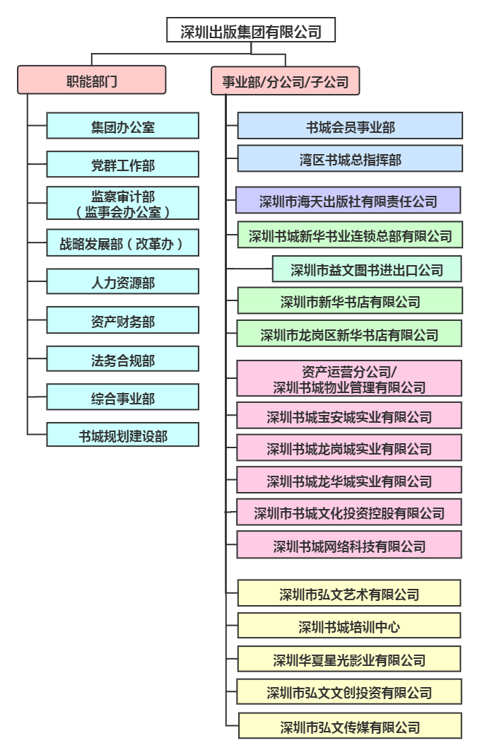 截至2020年底,集团公司资产总额32.12亿元,固定资产原值16.78亿元,共有员工2000余名,主要业务由内容出版、出版物连锁经营、资产运营、文化创意四大板块组成,涵盖出版、发行、书城书吧运营、图书进出口、影城运营、教育培训、创意产品、文化休闲等领域。目前拥有21家全资、控股下属企业,6座超万平方米的大型书城,以及“深圳读书月”“深圳书城”“新华书店”“24小时书吧”“简阅书吧”“弘文艺术”“书城培训”“益文书局”“华夏星光影城”“深港台创意设计廊”“深圳晚八点”“全民阅读数字出版分众平台”等多个知名文化品牌。拥有图书、音像、电子、网络、手机等全媒体出版资质,年出版品种600多个。