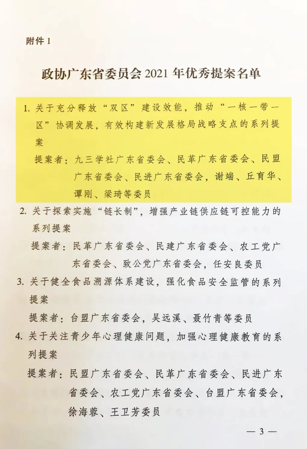 2021年,九三学社广东省委会、民革广东省委会、民盟广东省委会、民进广东省委会以及省政协委员谢端、丘育华、谭刚、梁琦,提出了“充分释放‘双区’建设效能,推动‘一核一带一区’协调发展,有效构建新发展格局战略支点”的系列提案,该系列提案入选政协广东省委员会2021年优秀提案奖“1号提案”。其中,梁琦为我院教授、博士生导师,丘育华为我院校友、EMBA校友理事会执行会长。