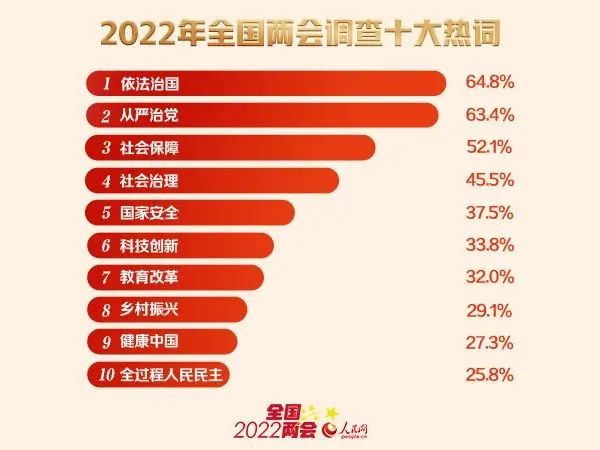 民之所盼,政之所向。据人民网开展的全国两会调查显示,“依法治国”“从严治党”“社会保障”三大热词关注度位居前三位,位列热度第四位至第十位的热词分别是“社会治理”“国家安全”“科技创新”“教育改革”“乡村振兴”“健康中国”“全过程人民民主”。