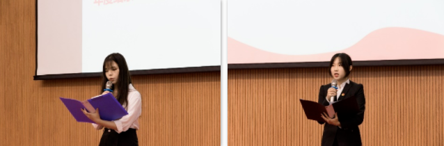 团委组织委员蒋晶晶(左)、学生会执行主席张颖妮(右)分别作报告