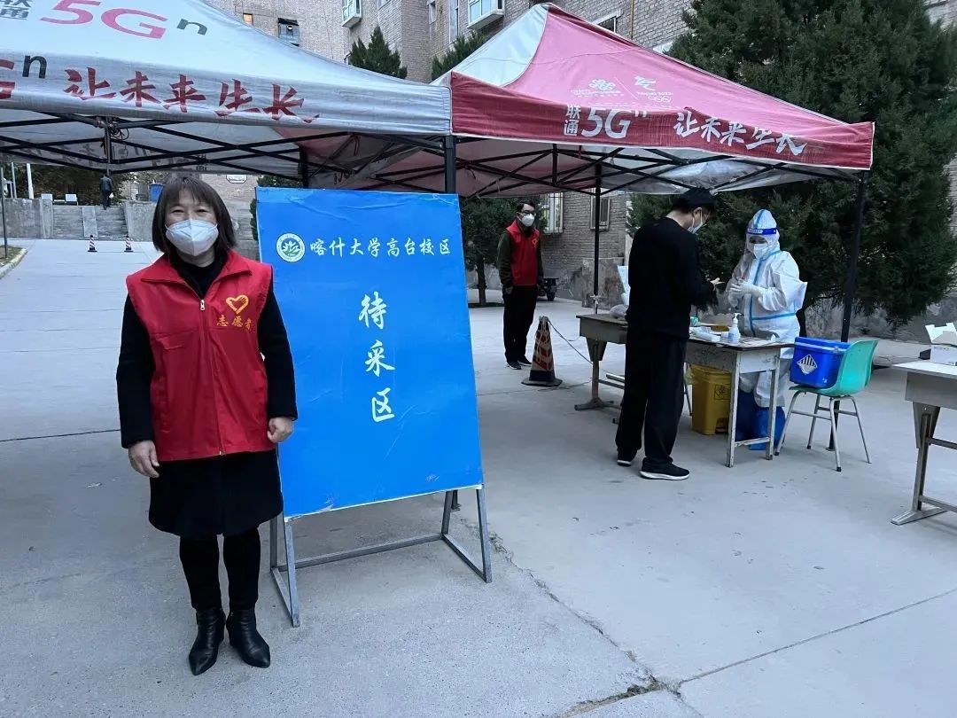 援疆的陈英老师在喀什大学高台校区家属院进行志愿服务,主要负责倡导大家非必要不外出、非必要不聚集,并积极参与运送物资。