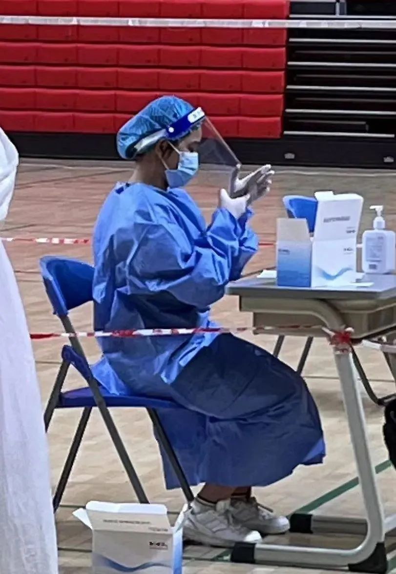 潘子逸在广州校区南校园新体育馆担任志愿者,主要负责核酸检测扫码录入工作。