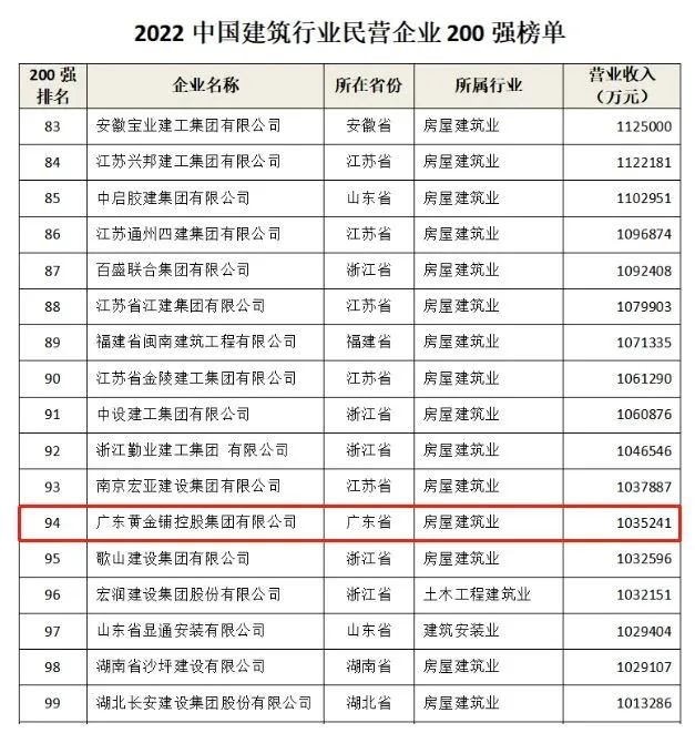 广东黄金铺控股集团有限公司(94名)入围建筑行业民营企业200强榜单前100强