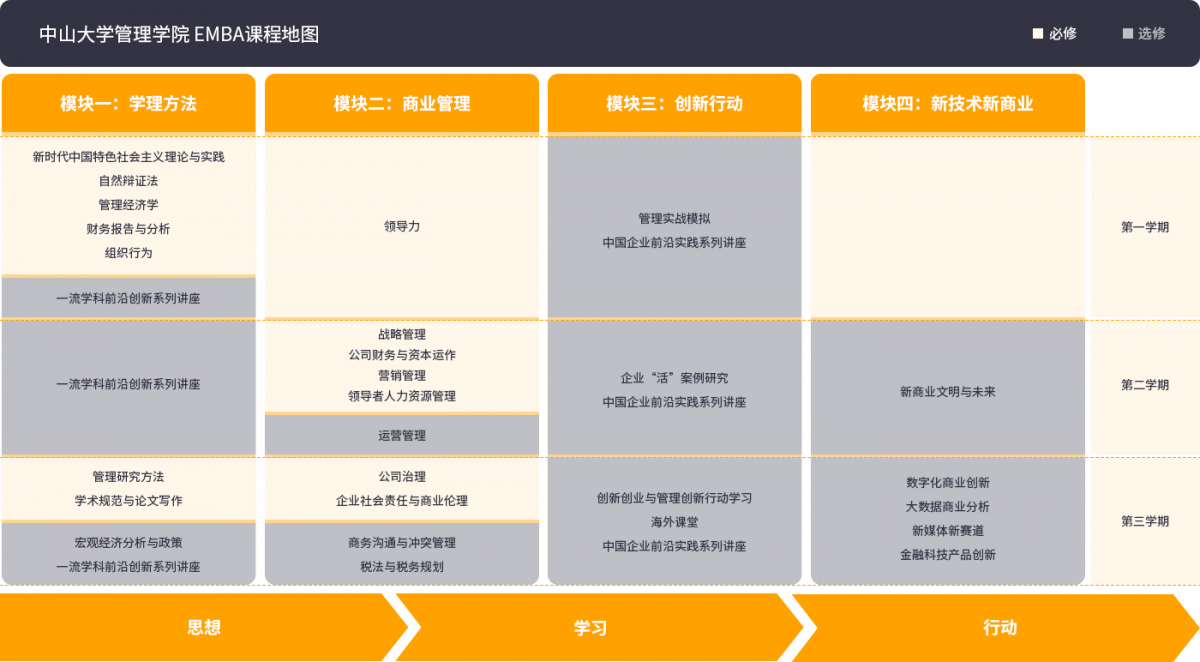 402永利集团官网EMBA项目强调学理以致用,对内依托学院工商管理学科优势和名师资源,对外聘请国内外知名经济学家、企业家为兼职导师,通过“学理方法”、“商业管理”、“创新行动”、“新技术新商业”四大课程模块,为学员提供扎实理论功底、拓宽企业经营视野、激发创新思维和商业灵感、领略前沿技术和商业新模式的学习平台。