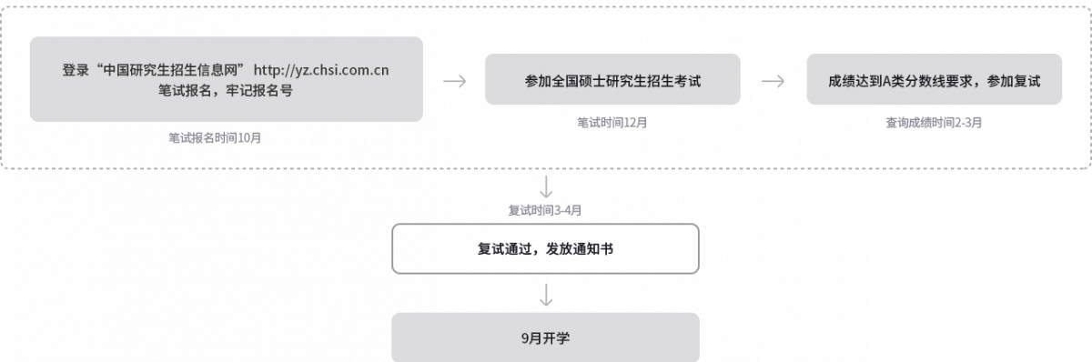 登录“中国研究生招生信息网”(http://yz.chsi.com.cn)报名笔试,一般为每年的10月。务必牢记报名号。