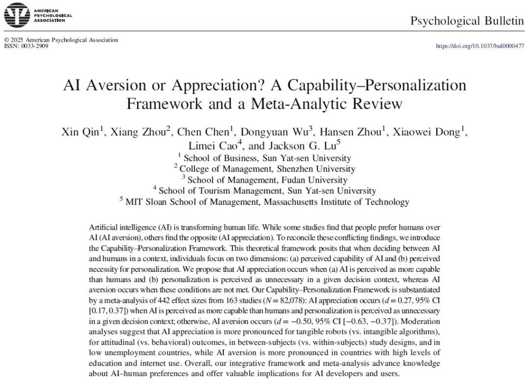 Recently, a research team led by Professor Qin Xinof the School of Business, Sun Yat-sen University proposed the "Capability-Personalization Framework". This framework elucidates the fundamental issue of when humans exhibit aversion or appreciation toward AI. The study was published in Psychological Bulletin, one of the top journals in the field of psychology. It is worth noting that since its establishment in 1904, only a few papers from domestic universities have been published in this journal as the first author institution. Moreover, this wok represents the first article in the journal addressing the theme of AI.