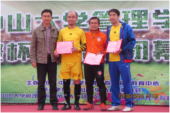 比赛组委会宣布,以本届比赛为契机,成立中大管院MBA足球俱乐部,并邀请EMBA足球协会副会长吴文伟校友、财务总监王仲校友、队长张继发校友为顾问。同时,本届比赛的各队长则自动成为俱乐部的首届委员会委员。俱乐部的宗旨是以足球为载体,加强中大管院MBA广大校友之间的沟通,包括EMBA、5M其他专业、以及兄弟院校之间的交流。同时积极关注及帮助大学校园足球运动的开展,以及支持贫困地区的少年儿童足球运动等,发挥更多的社会责任。MBA教育中心主任王远怀老师上台为组委会代表金澎和孟凡杰授旗并为俱乐部顾问颁发了聘书。