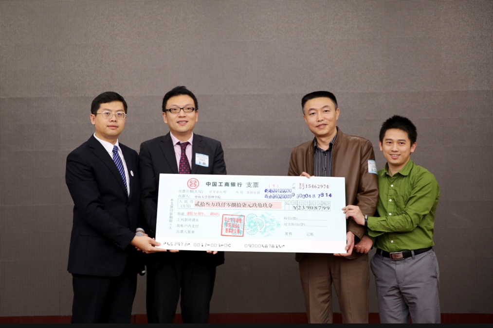 蔡昌俊校友讲话结束后,作为本次众筹活动的协办方微圈发起人李泽江校友与MBA联合会主席苏衡同学,上台与蔡昌俊校友一起将代表众筹成果的支票赠送给王帆副院长,代表着本次众筹收到的款项都将用于学院的教育事业。