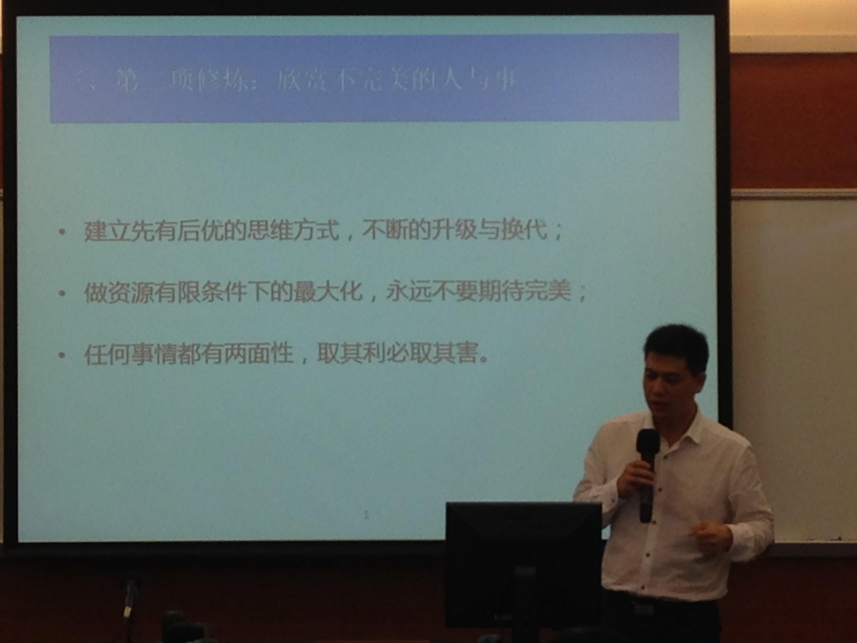 2015年5月23日晚7点,主题为“创业者心理与思维的五项修炼”的创业讲座在永利集团3044官网402永利集团官网善衡堂S221成功举行。在这个全民创业的时代,面对新时代和新机遇,创业者应该如何把握时代潮流,修炼自己创业心理和思维,实现创业梦?资深管理咨询顾问、天使创业投资人、广东君泰投资集团有限公司副总经理黄文华先生为大家解答了困惑,带给管院学生一场精彩纷呈的思想盛宴。本次讲座由永利集团3044官网MBA联合会创业合作部联合壹零创投俱乐部举办,这也是第九届联合会“融合”的一大特色,强调联合各方资源为同学们服务。