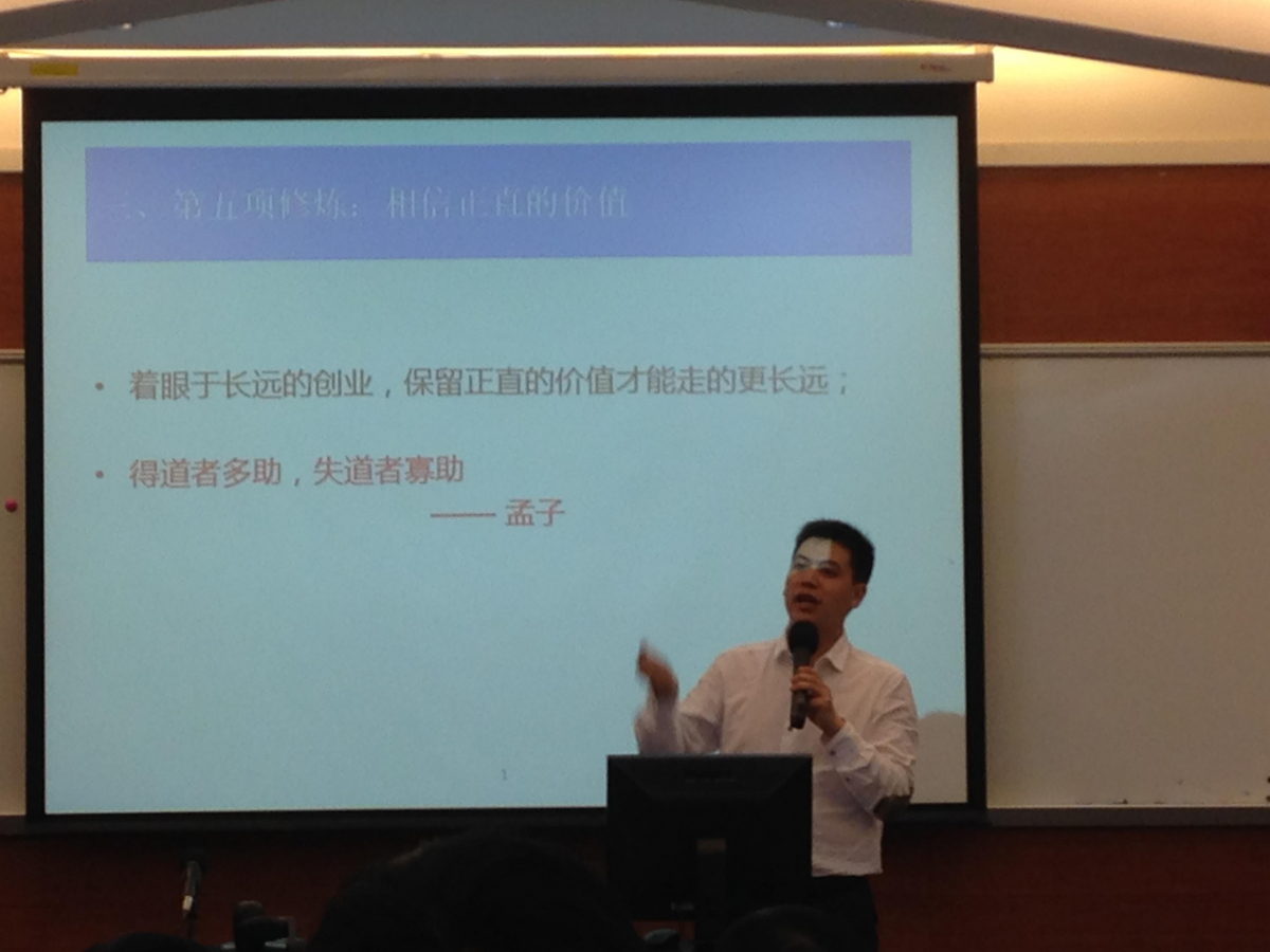 为了更好地帮助大家理解思维的转变和心灵的升级,黄总引领在座的同学进入了本次讲座的主题——创业者心理与思维的五项修炼。通过黄总生动细致的讲解,大家从第一项到第五项循序渐进地修炼出了深厚的基本功,完成了一次创业心理的升华。