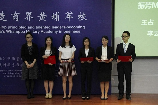 刘静艳副院长为获得“振芳MBA奖学金”新人奖和 “英语优异奖”同学颁发荣誉证书