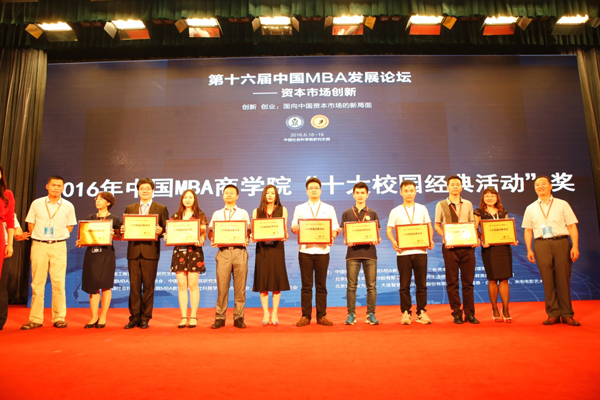 (第十届MBA联合会副主席郑燕群代表学院领取“2016年中国MBA商学院十大校园经典活动”奖)