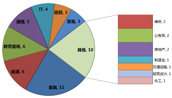【从事何业】金融行业11人当仁不让稳坐头把交椅,其次是能源行业6人,以及教育咨询行业6人……