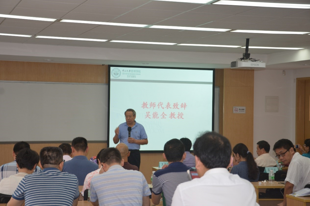 接着是感谢师恩、回馈母校的环节,校友代表向学院赠送字画,以及向各位在场的恩师赠送鲜花。随后由教师代表吴能全教授的发言掀起了全场的高潮。吴教授又再一次作为传道授业的导师给返校的校友上了一堂生动又实用的课,给大家提出了“一个圆点”、“六桶金”到“全面管理”等理论,给正在创业以及创业发展过程中的校友带来了宝贵的战略战术,引得现场雷鸣般的掌声。