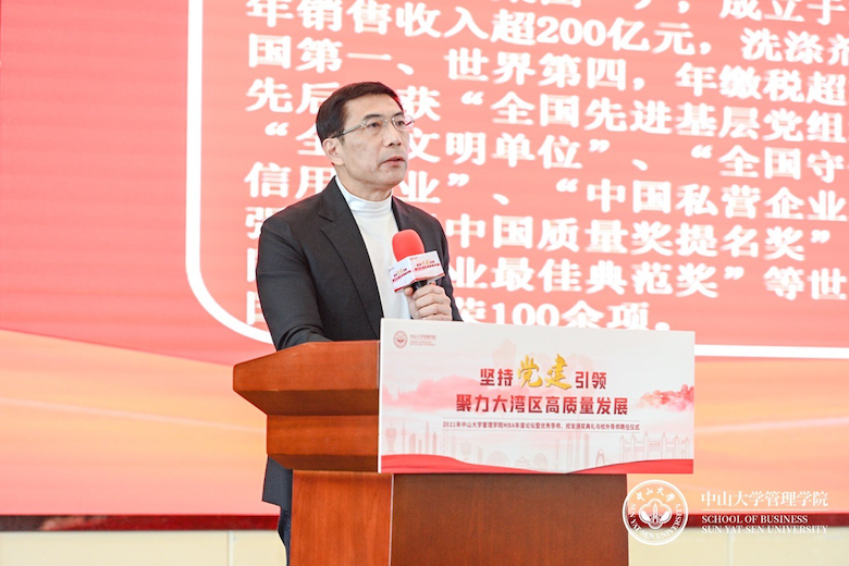 随后进入主题分享环节,立白集团党委书记、副总裁许晓东围绕“党建引领,立足湾区开新局”主题做演讲。许晓东书记从立白集团党建工作简介、六大党建创新和“党建引领,履行社会责任,促企业行稳致远”三部分,为大家分享了立白集团在党建工作的一些做法和体会。他提到,立白集团坚持绿色发展理念,为建设美丽中国、美丽大湾区贡献力量;在难事大事中显担当,发挥党组织作用,充分体现了集团的社会责任。在中国共产党的正确领导下,立白集团的党建工作为集团提供了强有力的保障,立白集团将不断开拓创新,引领企业高质量发展,跟党一起奋斗,跟党一起圆梦。