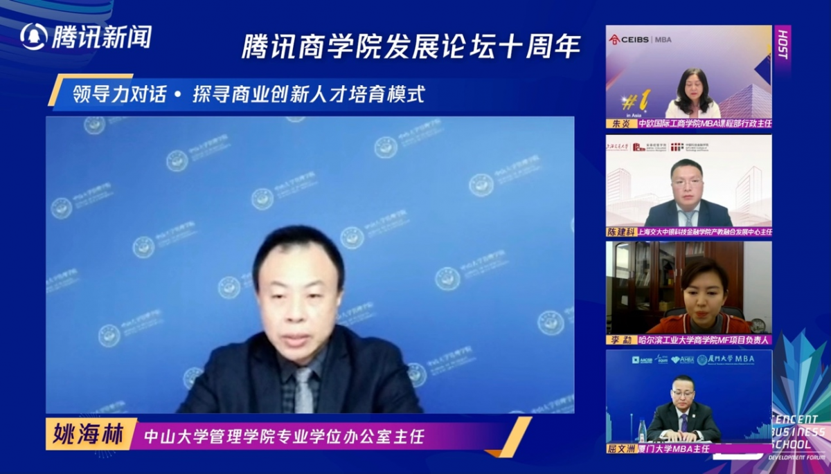 我院专业学位办公室主任姚海林博士受邀参加了“探寻商业创新人才分培育模式”线上圆桌主题论坛。姚主任就经济“双循环”新格局下,我院专业学位商科人才的差异化定位、国际化培养以及打造核心竞争力的做法进行了分享。