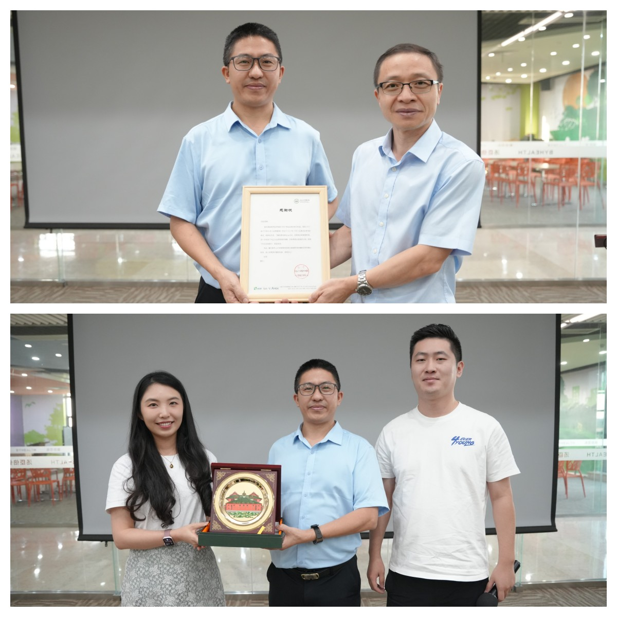 为感谢汤臣倍健对本次参访的热情接待和悉心安排,课程最后我院张才文老师代表学院向企业赠送感谢状,同时本次活动组织者廖玮灵同学代表班级为郎经理送上纪念品。