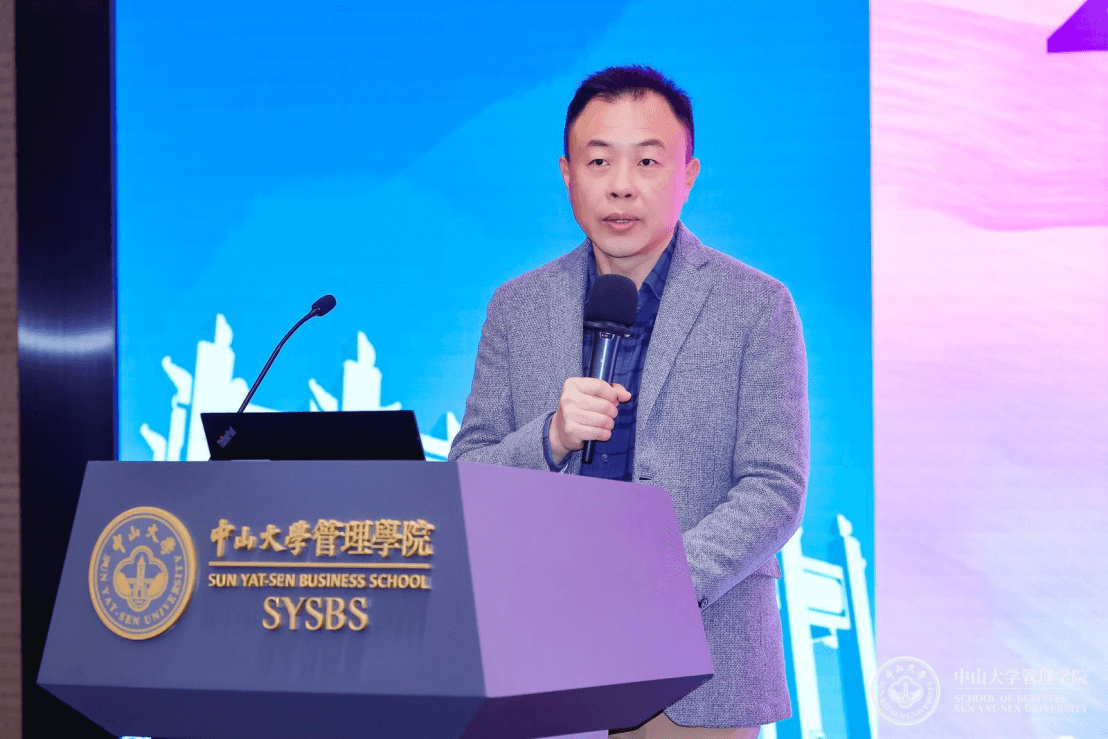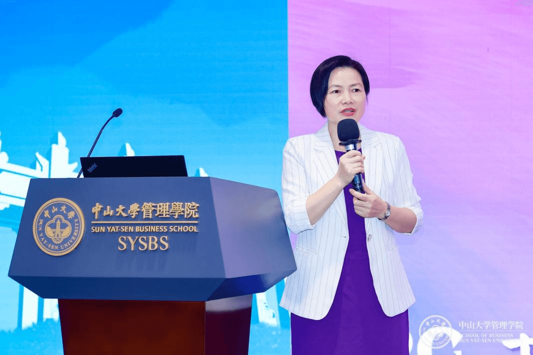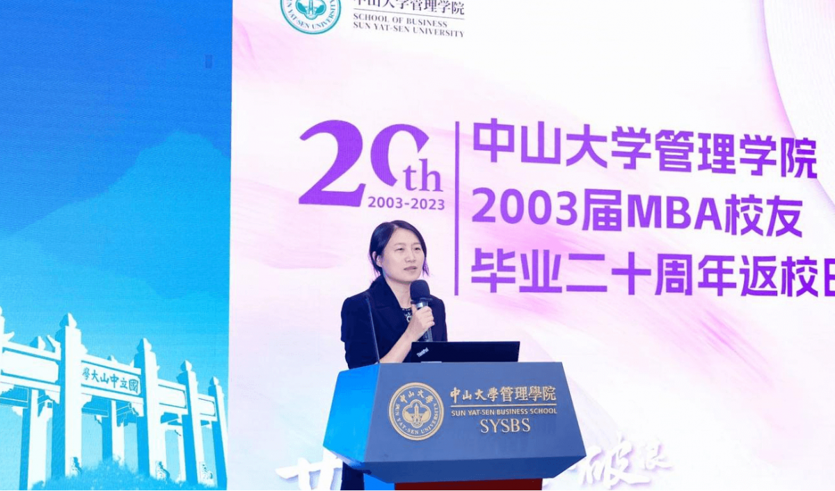 在校友分享环节,2000级春季MBA代表唐芬校友首先表达了对母院及老师的感激之情,并对母院的学科建设、教学质量和国际化等方面的发展给予了高度肯定。她回忆了自己在学院的学习经历,强调了中大学习这段经历对自己的人生产生的深远影响。她鼓励同学们继续学习,不断提升自己,在工作中发挥所学。