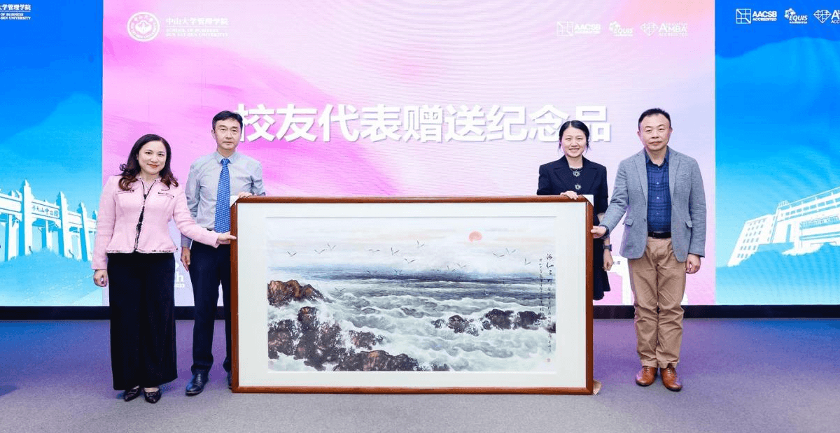 校友代表致送纪念品《海纳百川》画作,这幅画以海浪和海鸥为元素,寓意着中大管院不畏困难、勇往直前的精神及广纳博大的胸怀,让校友们像海鸥一样自由翱翔、自由拼搏。这幅画也是校友对母校的祝福和期许。