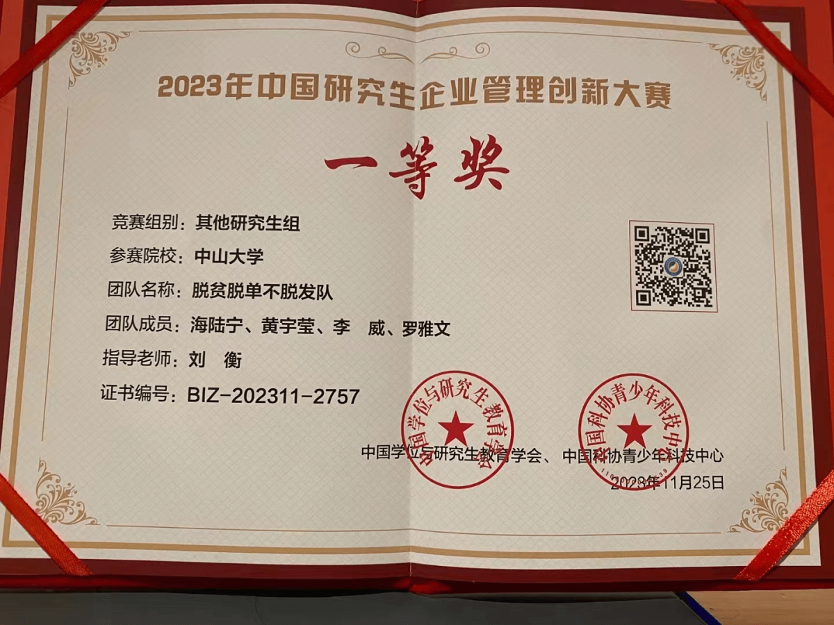 近日,2023年中国研究生企业管理创新大赛总决赛在上海大学圆满落幕,大赛由教育部学位管理与研究生教育司指导,中国学位与研究生教育学会和中国科协青少年科技中心共同主办。在永利集团3044官网402永利集团官网刘衡教授的指导下,我院“脱贫脱单不脱发”队荣获其他研究生组全国一等奖—(赛事全国最高奖项),“逸往无前”队荣获MBA组全国二等奖,“填空题全队”“简致卓越队”“富爸爸队”荣获MBA组全国三等奖,充分展现了中大管院学子敢于拼搏争先的风采。
