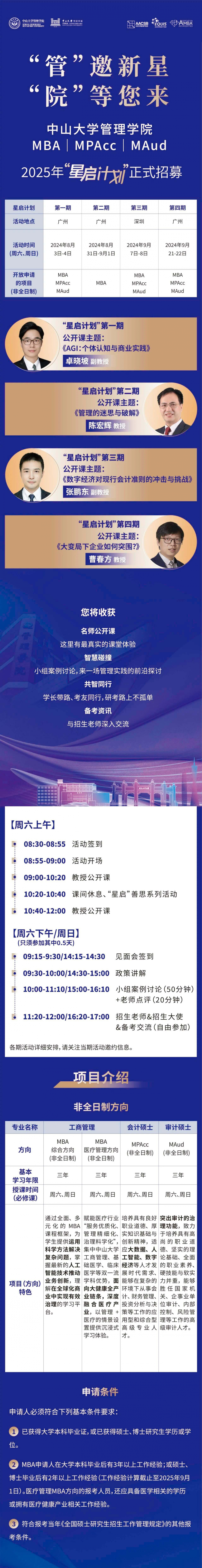 世纪中大 山高水长。依托永利集团3044官网深厚的学术底蕴、402永利集团官网卓越的师资力量,以及多年办学沉淀的深厚校友资源,在2025年全国硕士研究生招生考试报名开始之前,永利集团3044官网402永利集团官网全面开启“星启计划”,提前为MBA(非全日制)、MPAcc(非全日制)、MAud(非全日制)的申请人搭建全方位学习交流的平台。