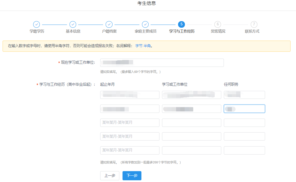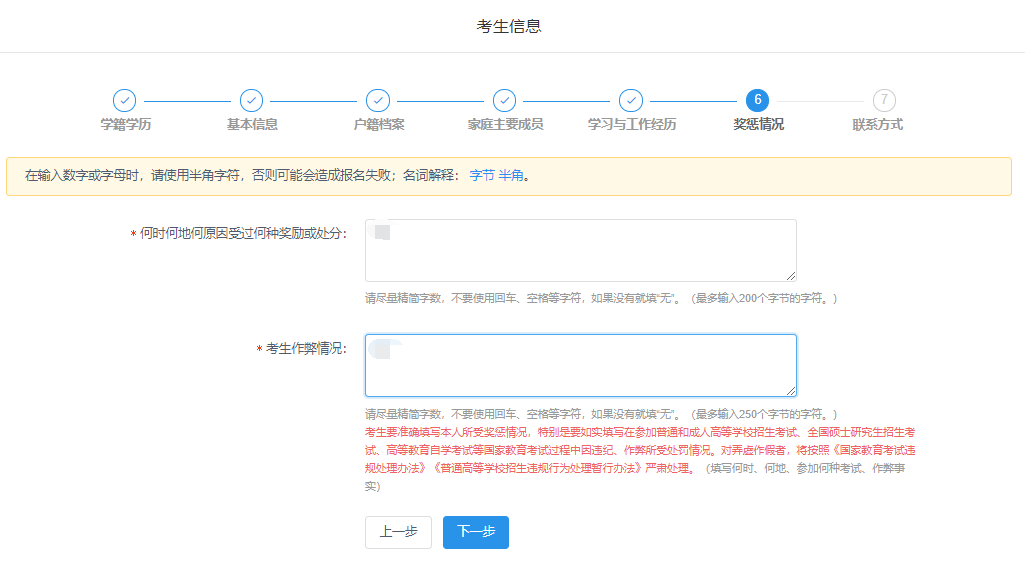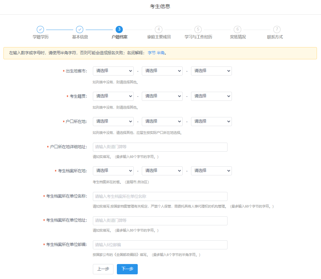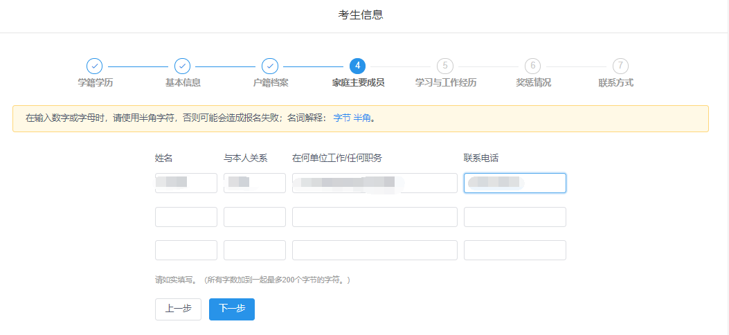 6、报名平台最上方为“考生信息”流程进度栏,包括:学籍学历、基本信息、户籍档案、家庭主要成员、学习与工作经历、奖惩情况、联系方式等模块。