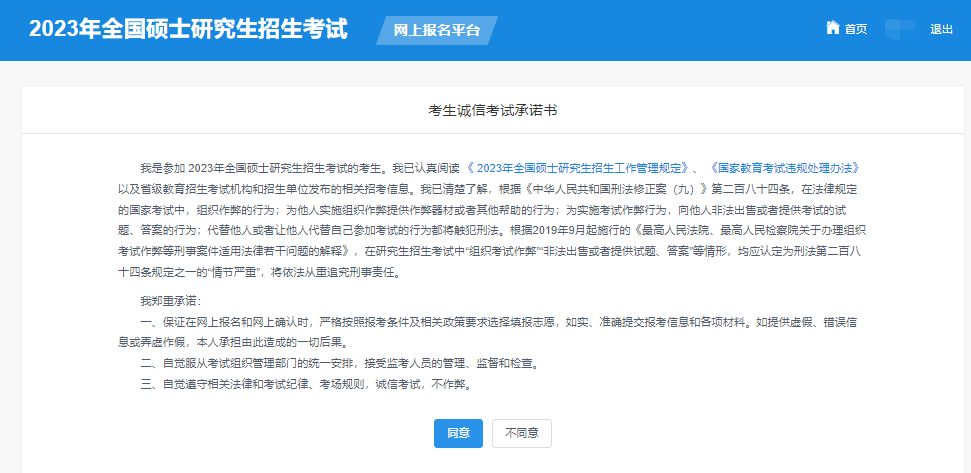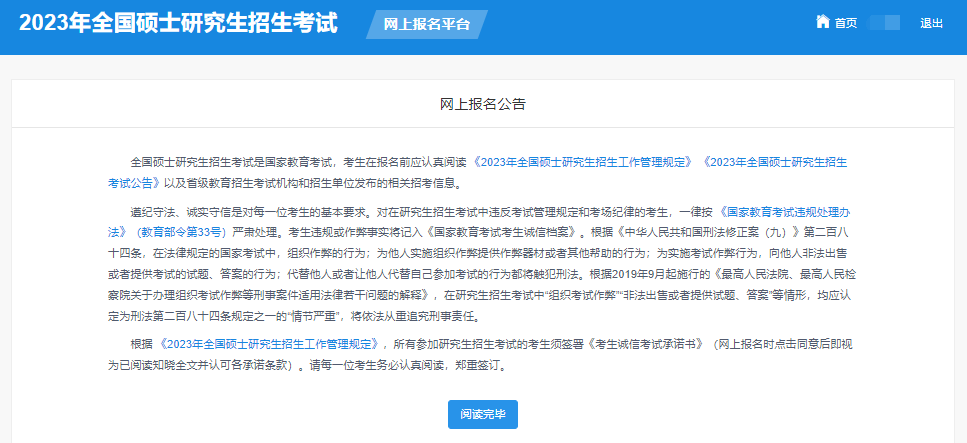 16、请仔细阅读网上报名公告后,点击“阅读完毕”,进入考生诚信考试承诺页面,仔细阅读后。点击“同意”。