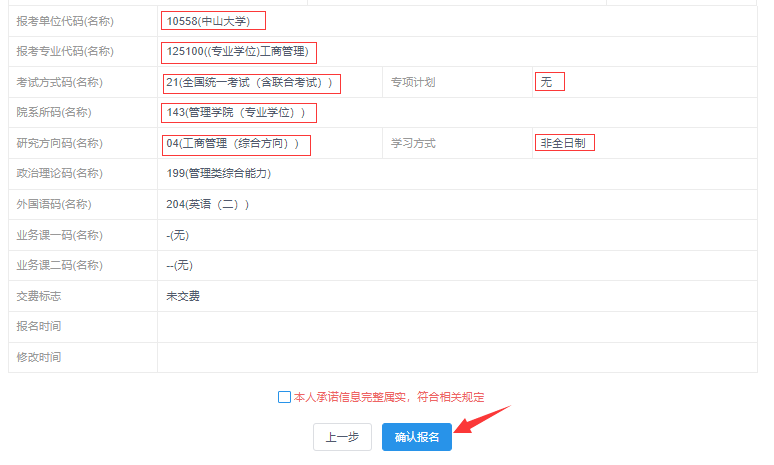 21、 最后确认报名信息:请按教育部、本人所在地省级教育招生考试管理机构、报考点以及报考招生单位的网上公告要求报名,凡不按公告要求报名、网报信息误填、错填或填报虚假信息而造成不能考试或复试的,后果由考生本人承担。报考信息一旦提交不可修改。