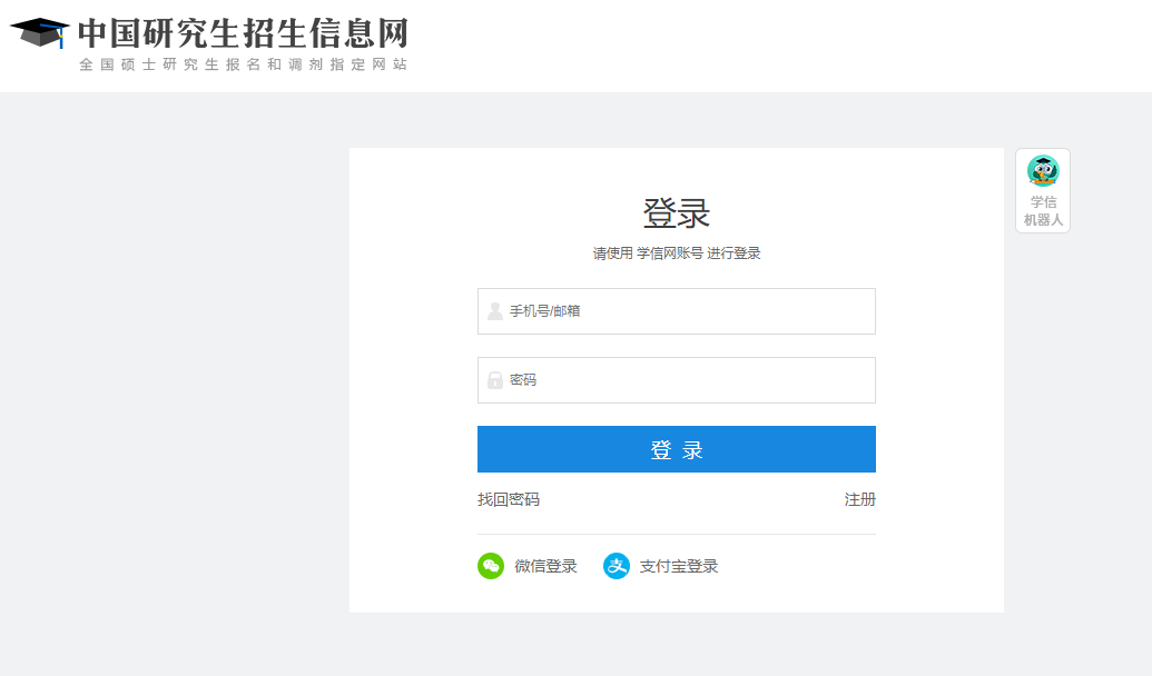 2、输入学信网帐号、密码登录,如未有帐号先请注册;支持使用微信或支付宝登录。