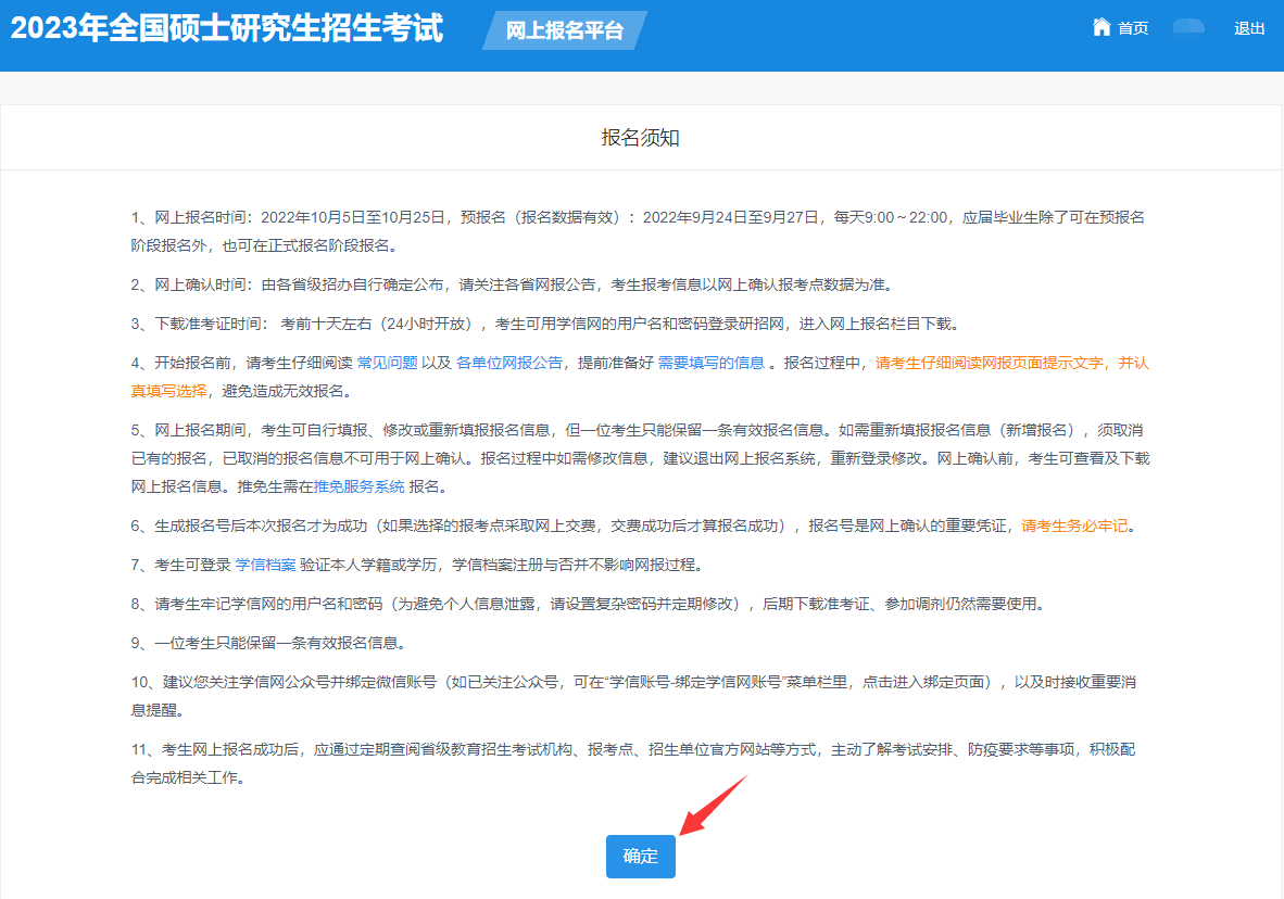 【报名时间段】2022年10月5日至25日,每天9:00-22:00(报名期间考生可自行修改网报信息或重新填写报名信息,但一位考生只能保留一条有效报名信息。逾期不再补报,也不得再修改报名信息。)
