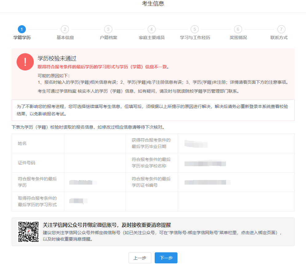 7、 完成“学籍学历”信息填写后,点击“下一步”进入学历验证页面,请耐心等待验证结果。学历校验未通过仍可继续点击“下一步”,填写考生信息。