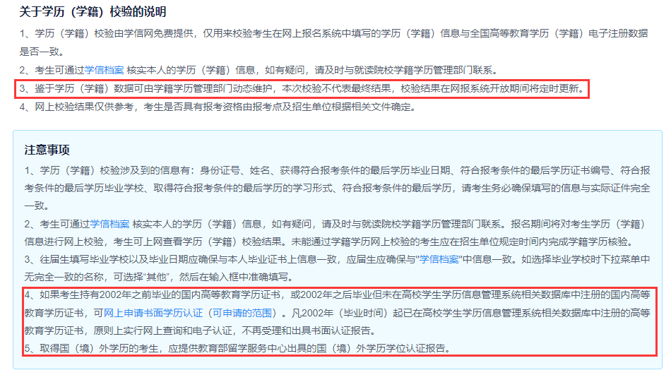 2) 校验结果在网报系统开放期间将定时更新,如确认信息填写无误,可于网报期间上网查看,或与原培养院校学籍学历管理部门联系;