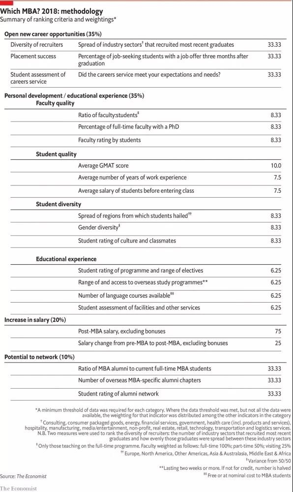 ▲2018年《经济学人》MBA排行榜的排名标准