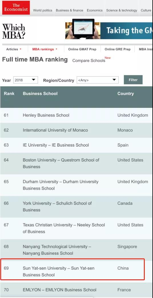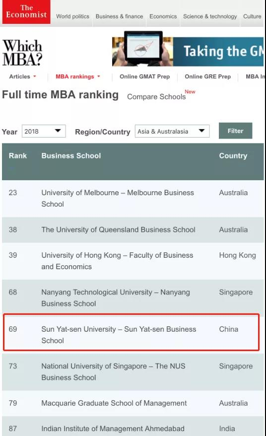 ▲中大管院MBA项目位列全球第69位(来源:《经济学人》官网)