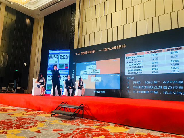 比赛正式开始,18支队伍带着他们对“创业十年路,从起步到扩张,’喜泊客’未来走向何方”的解决方案登台比赛。通过方案陈述、对手挑战、观众质疑、评委追问四个环节的PK,各队伍向评委和观众展示大胆构想、缜密求证的分析,表现出了严谨的学术功底和雄厚的商业思维实力。“Batman”队提出市场渗透战略、多元化战略,打造智慧停车的一体化综合平台,赢得了评委和观众一致认可,最终获得全场季军。