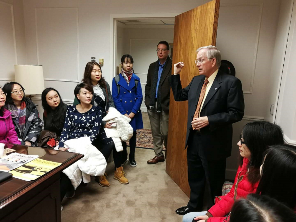 11月7日,在俄克拉荷马州立大学的国际交流项目负责人Prof. Johnson的带领下,我院师生参观了俄克拉荷马州的州议会大厦,受到了主管教育的参议员Mr. Douger的亲切接待,并近距离了解了美国的州议会大厦历史、制度及日常运作。