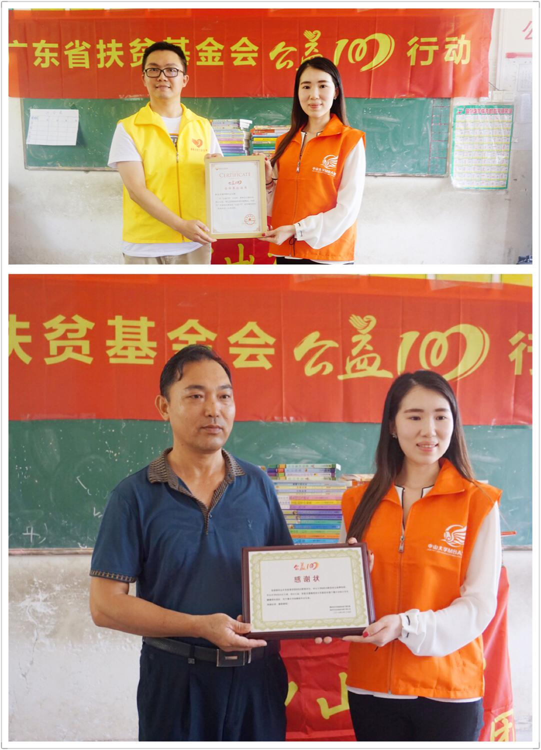 活动开始之前,梅州市五华县转水镇下潭小学钟校长为永利集团3044官网MBA义工团颁发了感谢状,并对大家的到来表示热烈欢迎。随后,广东省扶贫基金会代表张竞锋先生授予永利集团3044官网MBA义工团为广东省扶贫基金会“公益100”合作单位称号,并颁发证书。