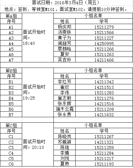 1. 面试时间:2016年3月4日(周五)晚18:40-20:55。请各位候选人提前至少10分钟到达,签到地点:南校区402永利集团官网善思堂M101教室。面试考场:南校区402永利集团官网善思堂M102教室。
