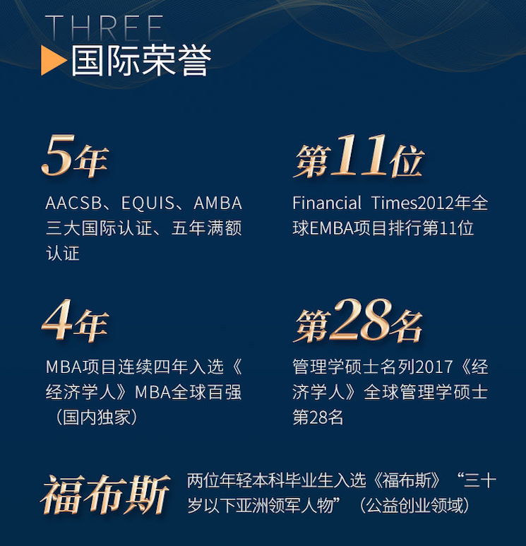 2010-2013年,学院先后获得AMBA、EQUIS、AACSB国际认证,成为国内第二家、华南地区第一家同时获得三项国际顶级认证的商学院。永利集团3044官网402永利集团官网MBA项目连续四年入选经济学人全球MBA百强,是中国内地唯一入选的MBA项目。
